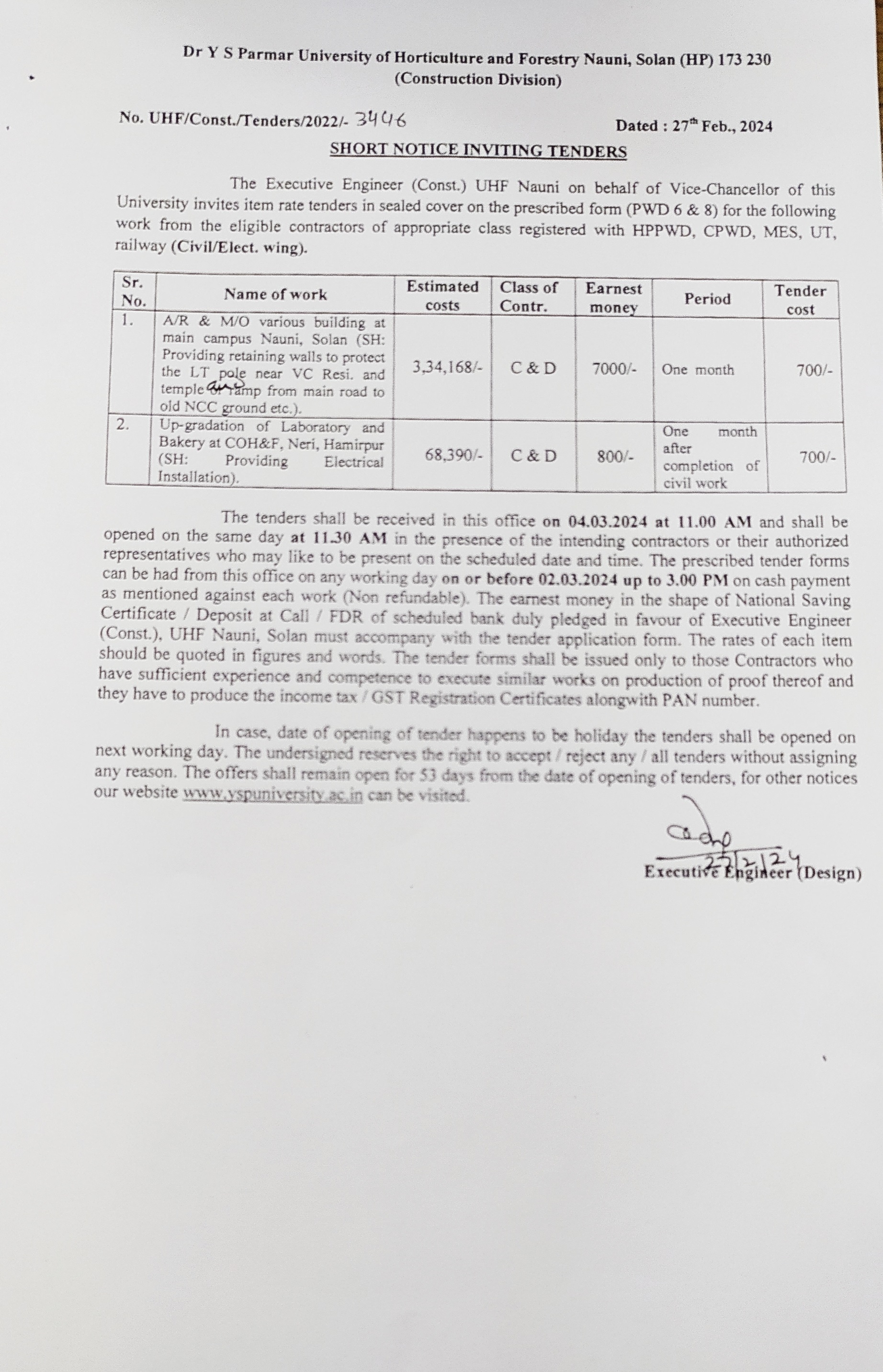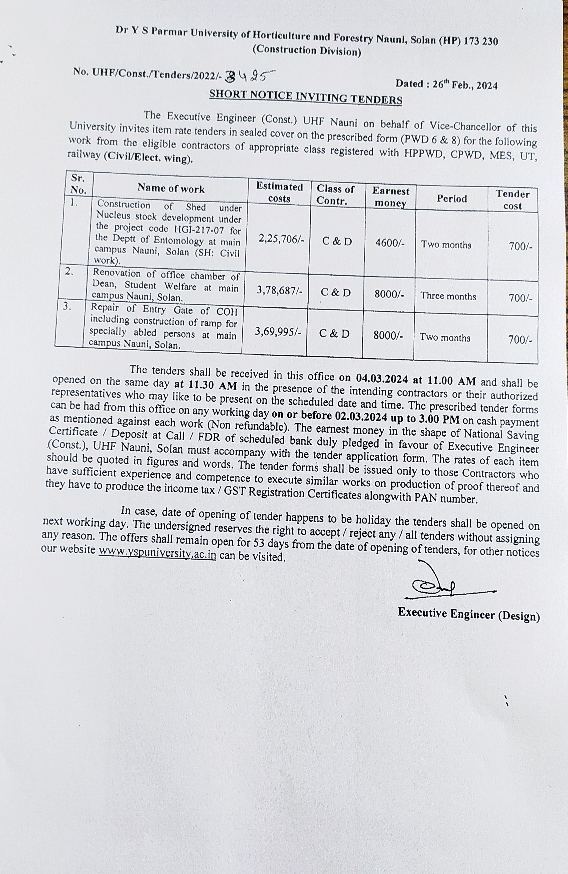 - Short notice inviting tenders for minor repair of College of Horticulture and covering of space under auditorium ramp at Dr. YSP University of Horticulture and Forestry, Nauni-Solan.pdf