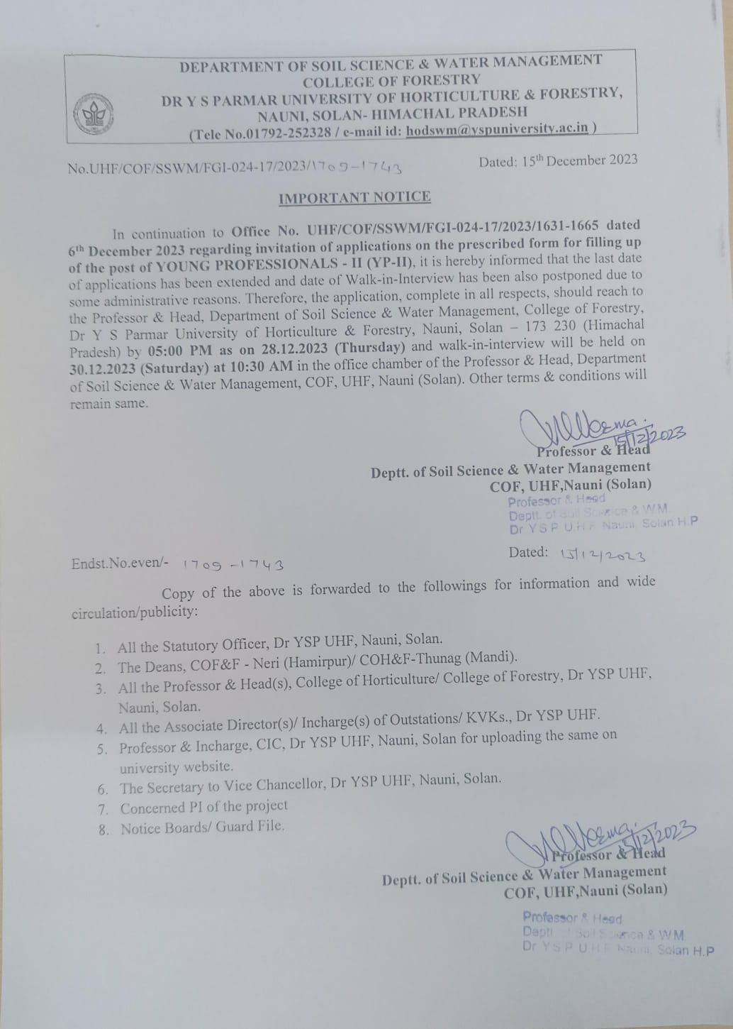 - Important notice for filling up the post of Young Professional -II (YP II) in the Department of Soil Science & Water Management